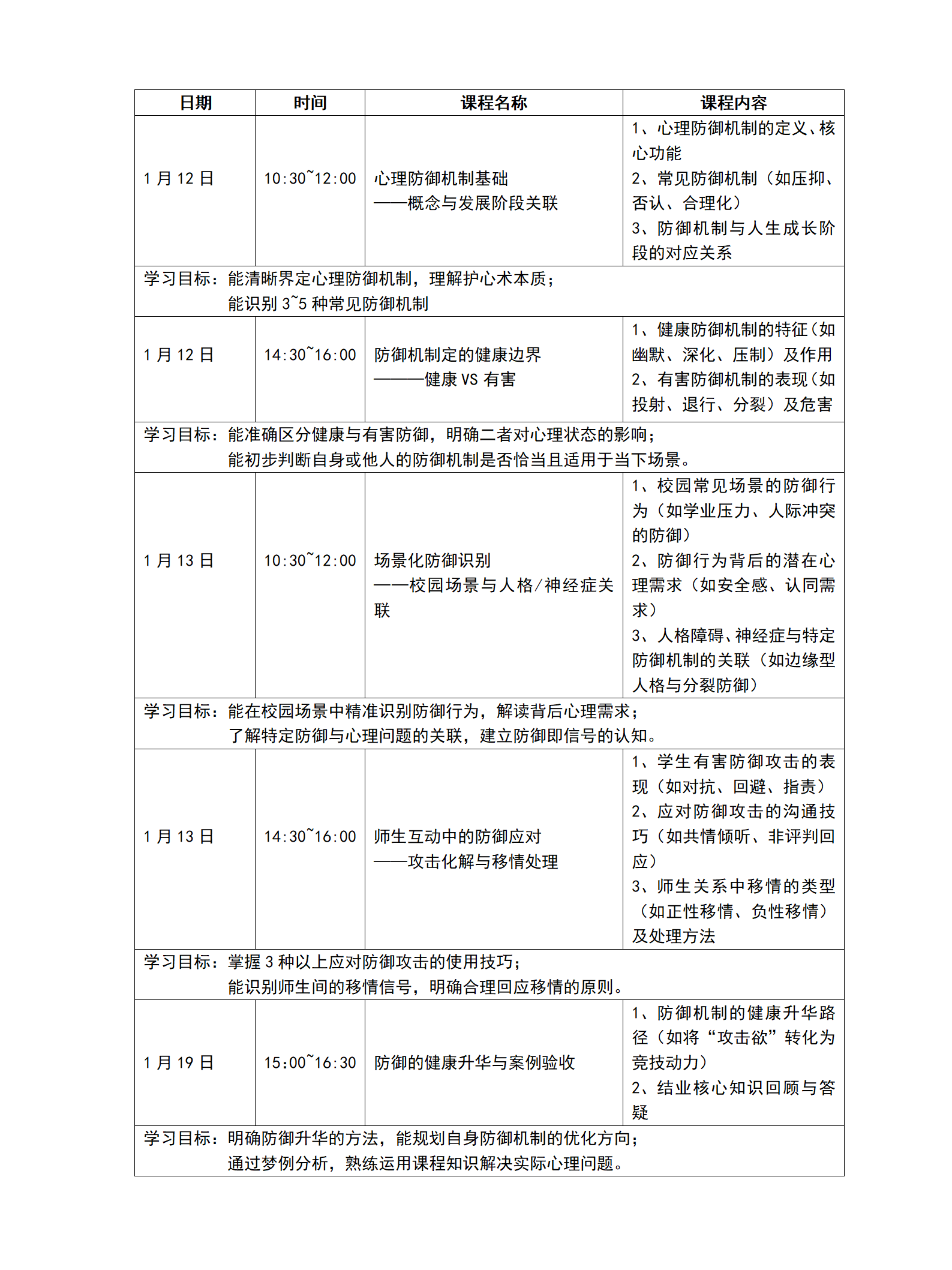 为贯彻落实《全面加强和改进新时代学生心理健康工作专项行动计划(2023-2025年)》的通知,我院面向社会开设《心理防御机制与校园师生心理支持》课程,欢迎广大师生踊跃报名参加,共同构建“以智慧心,以美润心”的温暖课堂,让师生关系从“防御”走向“连接”。